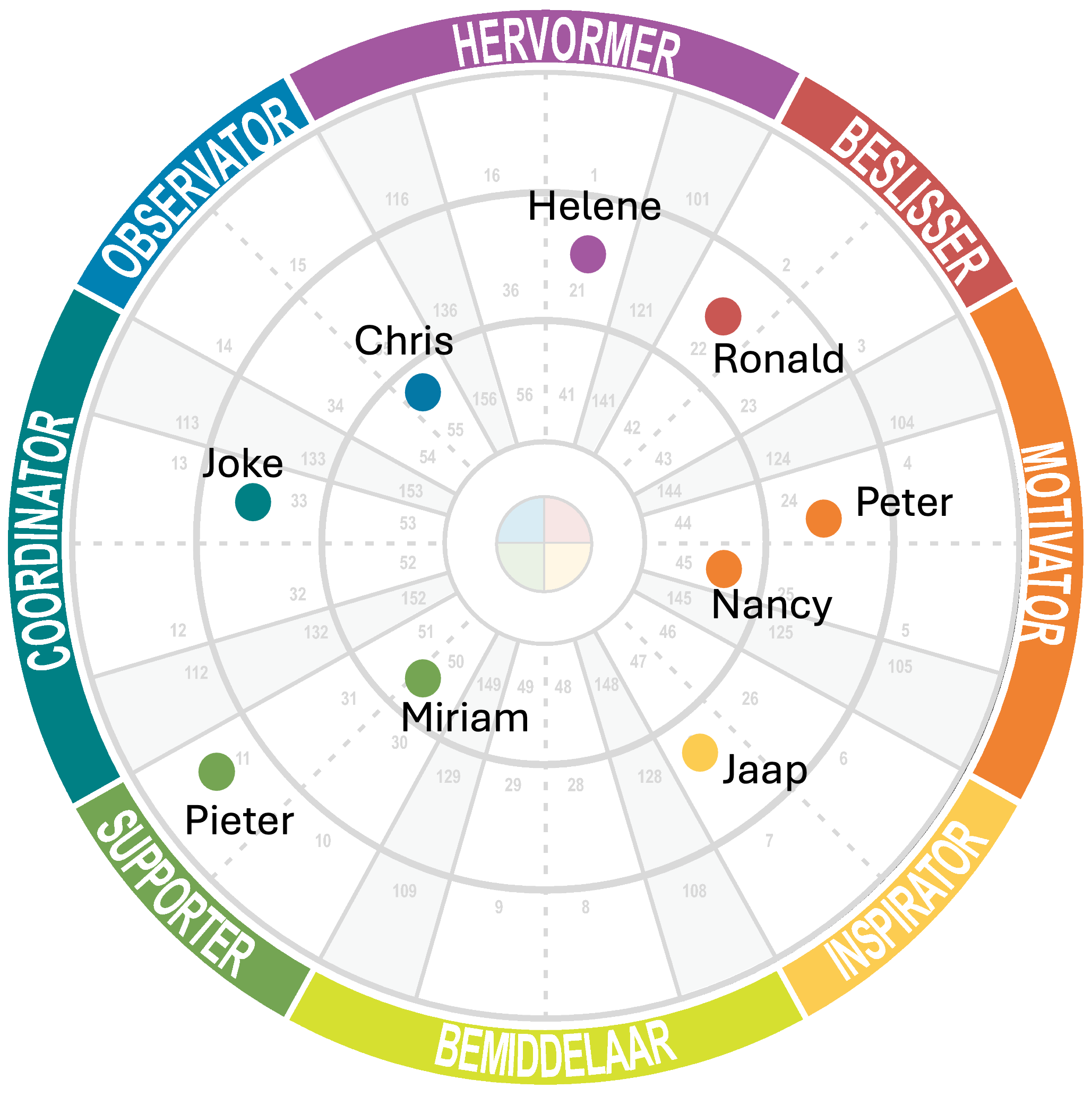 De positie op het ‘Insightswiel’ is afgeleid van de acht persoonstypen. In elk individueel profiel is dit persoonstype en de bijbehorende wielpositie opgenomen. Wanneer ik met een team of afdeling werk, stel ik altijd een teamwiel op. Dit teamwiel bestaat uit alle individuele wielposities. De gehele teamdynamiek wordt daarmee goed zichtbaar. Door praktijkvoorbeelden met het team te bespreken (ook zaken die tijdens een teamdag gebeuren) wordt de wijze van samenwerking in het team inzichtelijk, verklaard en bespreekbaar. Waar gewenst kan er worden geoefend en kunnen er concrete afspraken worden gemaakt over een betere en effectieve wijze van samenwerken. Van elk individueel teamlid wordt duidelijk hoe er het beste met deze persoon kan worden gecommuniceerd. Het wordt zo inzichtelijk hoe de individuele personen uit het team beter met elkaar kunnen omgaan en hoe de leiding het team en de individuele teamleden het beste kan ‘aansturen’.